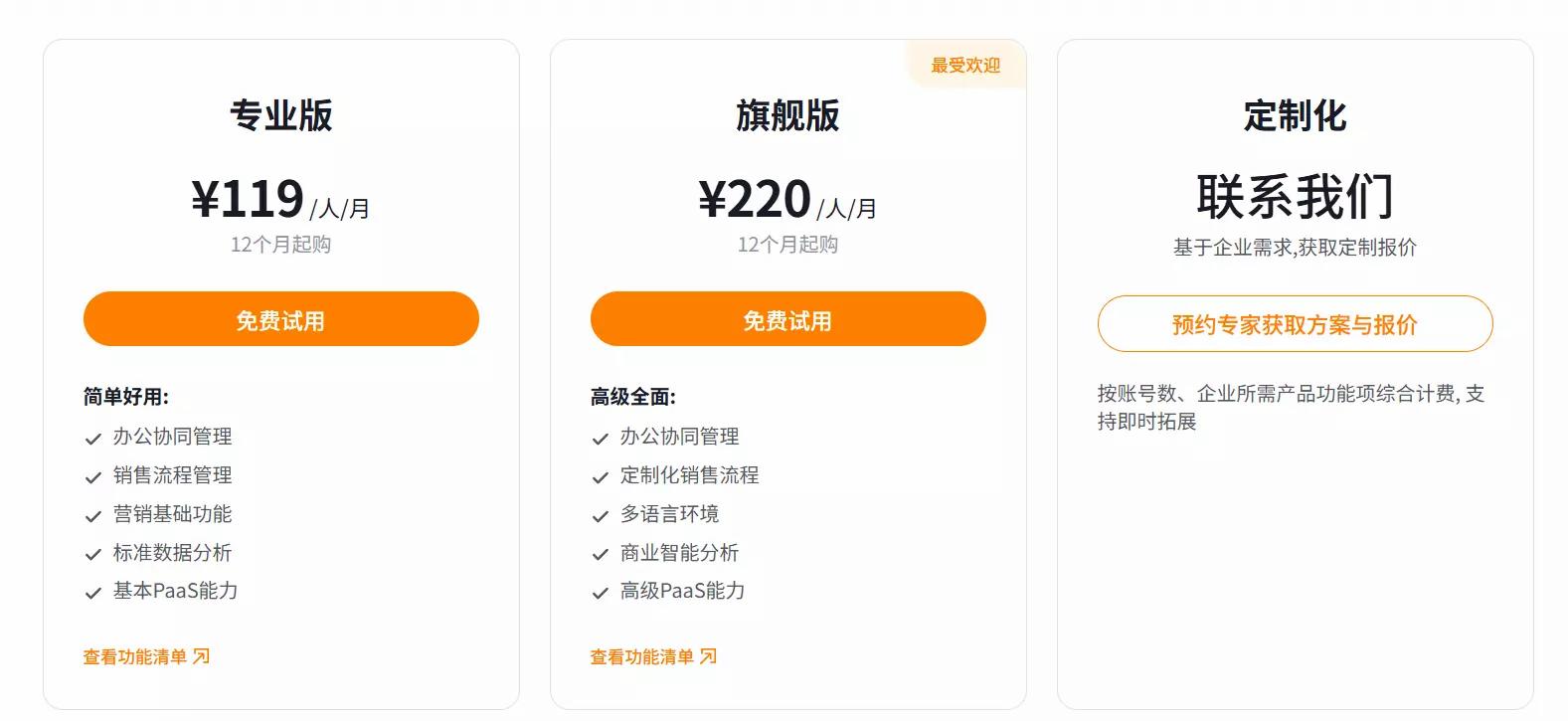 以纷享销客SaaS CRM软件的价格体系为例,共分为2个版本:专业版、旗舰版。每个版本按人·月付费即可,计算简单方便。