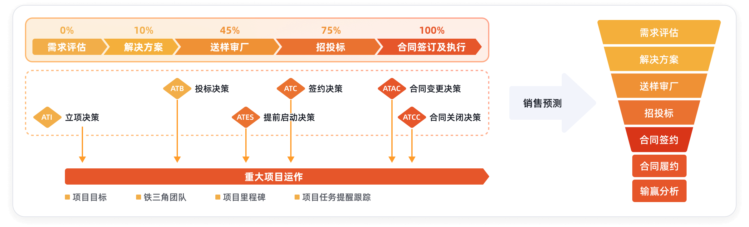 商机阶段标准化与过程管控:根据制造行业客户的采购旅程,将商机跟进划分为初步接洽、需求调研、方案呈现、商务谈判、合同签署等标准化阶段,为每个阶段设定明确的关键任务、交付物和推进标准;销售可实时在系统中更新商机进展,管理层通过销售漏斗实时监控所有商机的推进情况,及时发现跟进受阻的商机并进行干预。