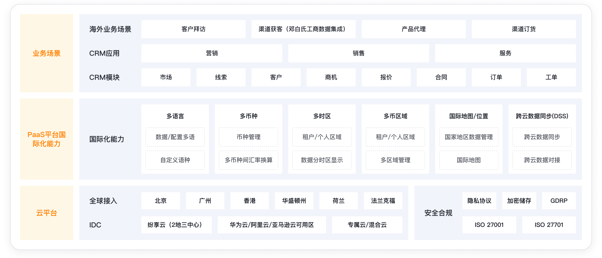 针对制造企业海外业务拓展的需求,打造专属的国际化运营解决方案,解决多时区、多语言、多币种、跨国协作等核心问题,实现海外业务的标准化、数字化管理。