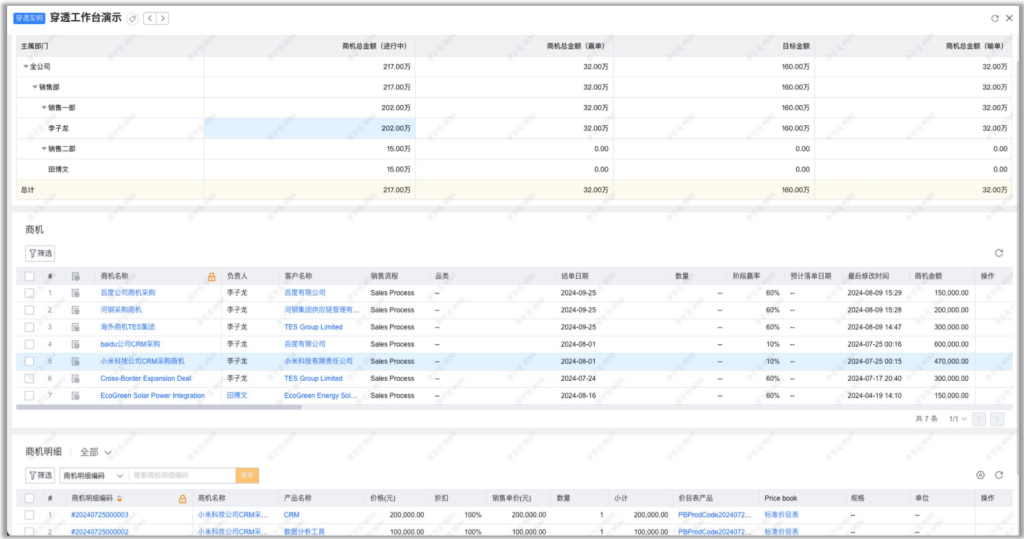 1.动态穿透能力:管理者查看汇总数据时,可直接穿透查看明细及关联业务信息,并直接做出下一步工作指令。