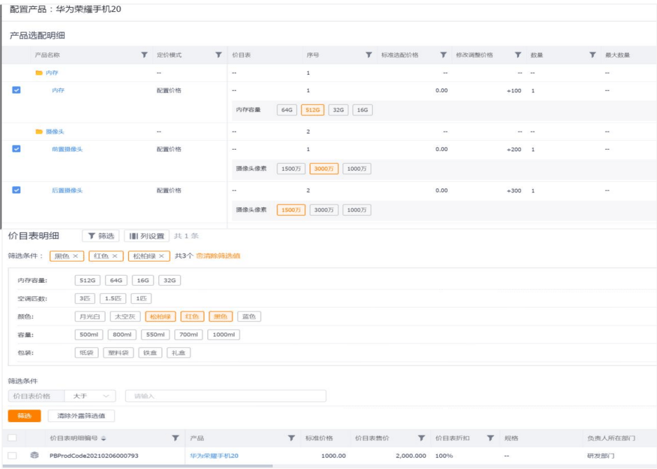 在纷享销客CRM的CPQ(配置-定价-报价)模块中,属性定价表现为: