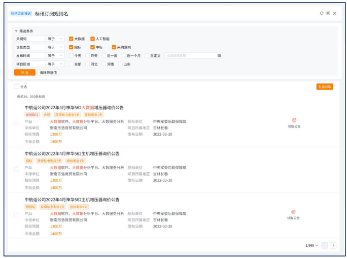智能订阅:通过设置订阅规则,系统会自动推送新增标讯信息。订阅条件支持按关键词、地区、招标单位等多维度设置,并可根据不同销售团队的需求定制推送规则。