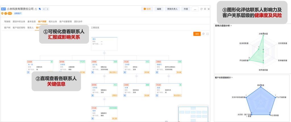 纷享销客MCR(Manage Client Relationship)模块通过"客户权力地图"可视化客户组织架构和决策关系,评估关系成熟度: