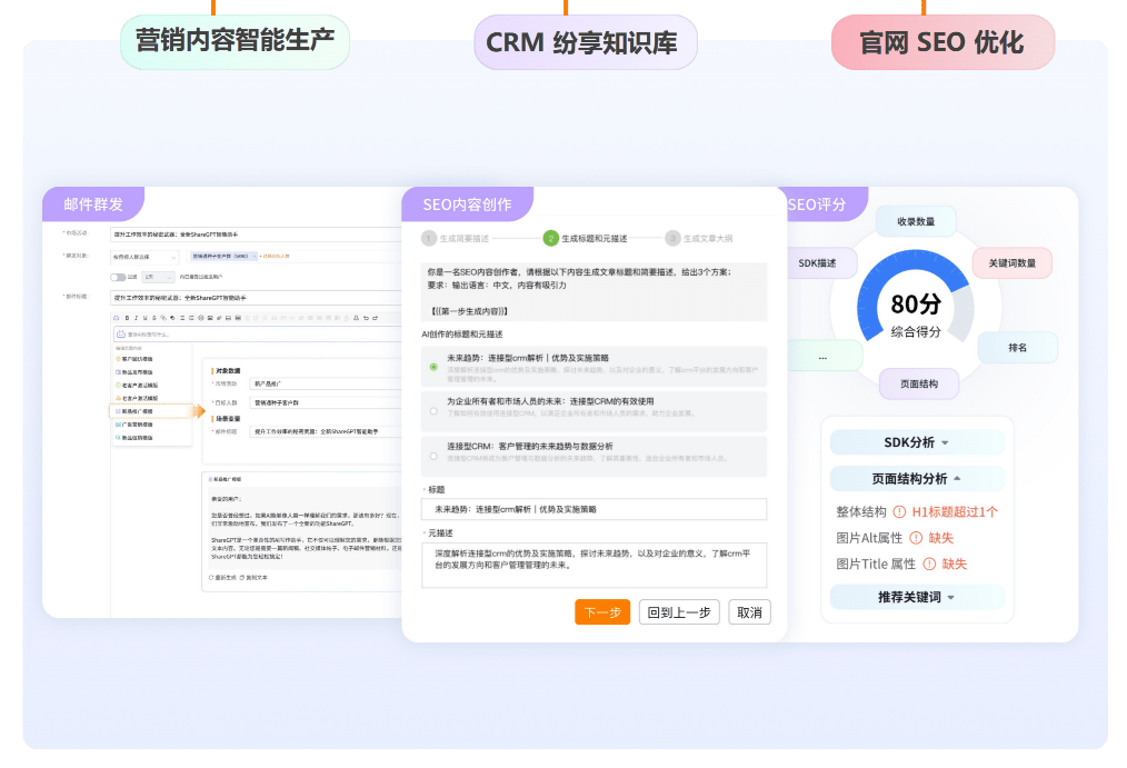 纷享销客的ShareAI平台清晰地展示了AI+CRM的深度融合,其应用可概括为以下三大核心领域: