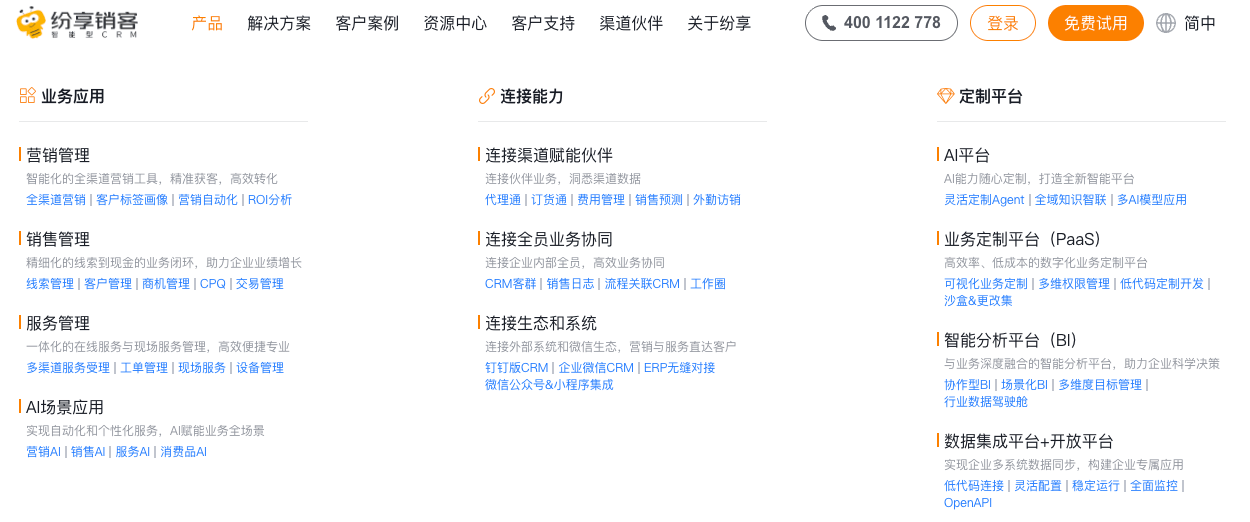 - AI 能力:纷享销客 ShareAI 平台将 AI 与 CRM 深度结合,打造了销售情报洞察 Agent、客户互动 Agent、7×24 客服机器人、营销创意 Agent、低代码编程 Agent 及智能 BI Agent 等全场景 AI 能力,全面覆盖营销、销售、服务与分析等核心业务领域。通过这些 AI 能力,平台能够实现商机挖掘、客户互动、服务提效、创意生成、开发赋能与智能决策的一体化闭环,助力企业提升业务效率和竞争力。
