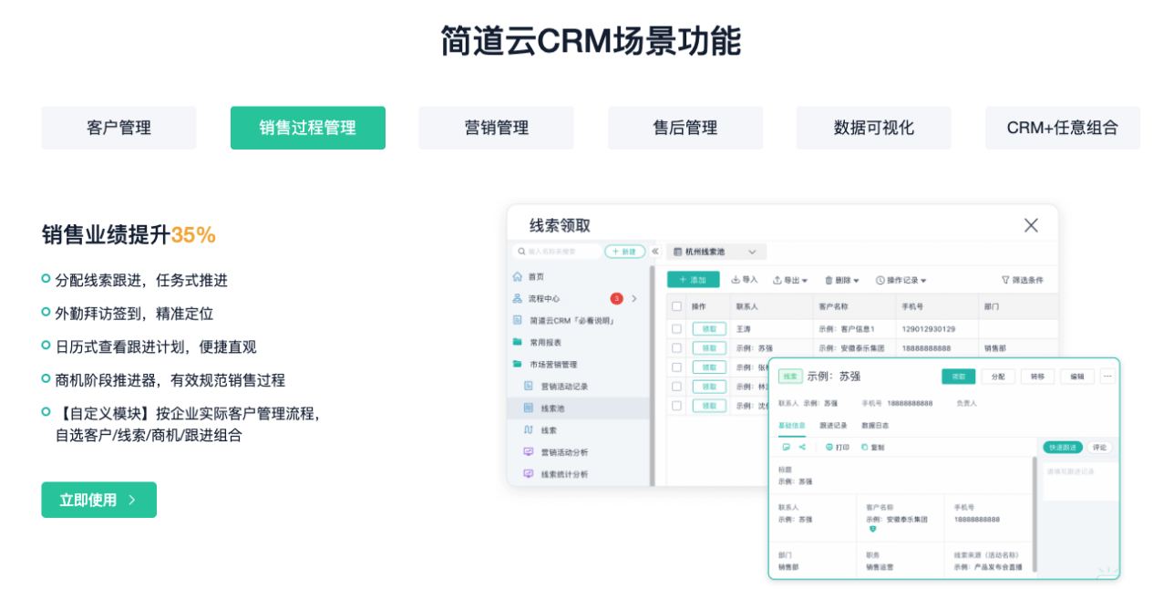 简道云的核心竞争力在于其强大的零代码/低代码平台能力。它并非一款功能固化的传统CRM,其CRM解决方案以高自定义性著称。凭借其灵活度,在小微企业和部门级应用中占比显著。