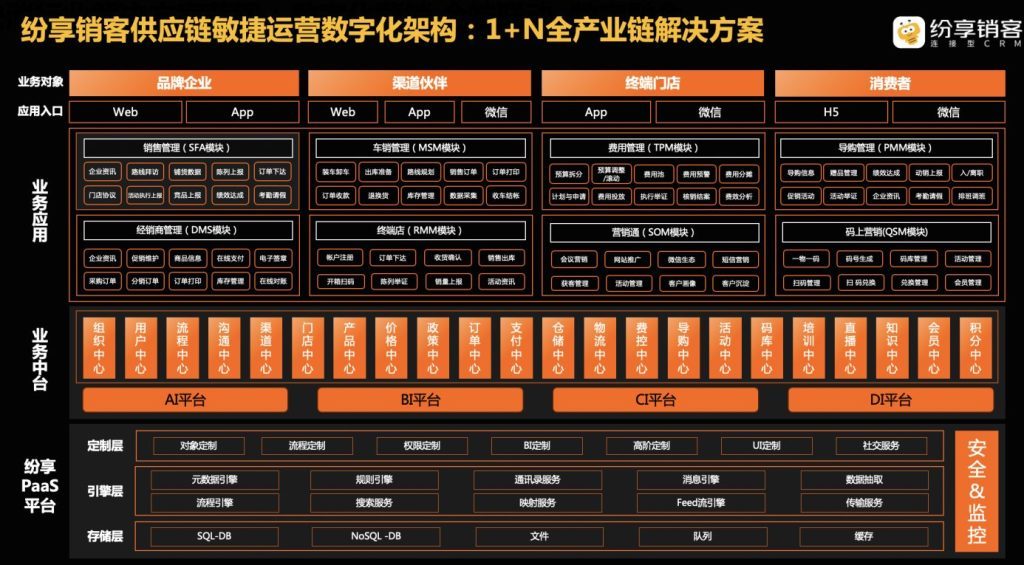基于上述考量,纷享销客从全产业链视角出发,为快消行业打造了产业链级的1+N解决方案,帮助上游企业和下游各产业链伙伴进行有机的数字化连接,实现产业链级的创新与融合。