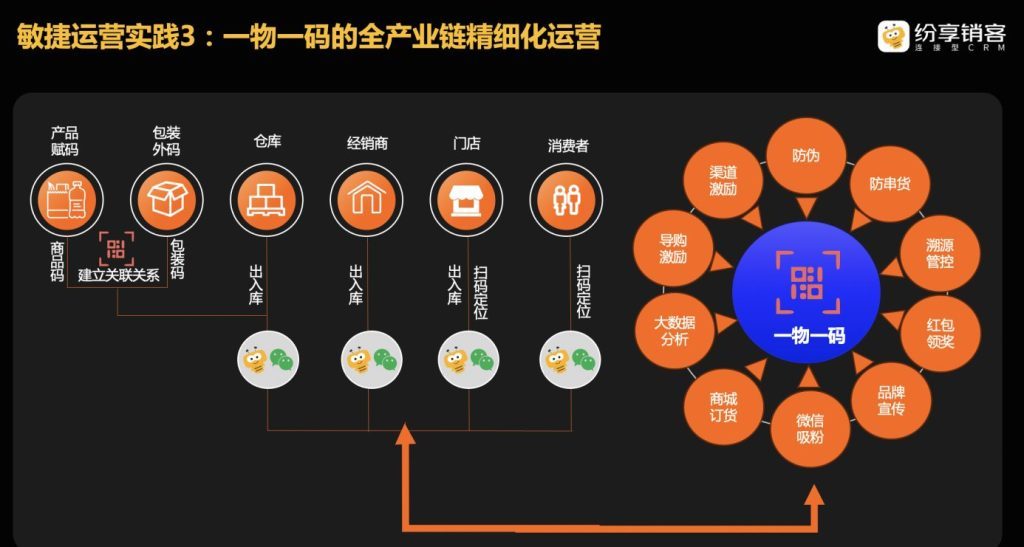 可以说,纷享销客系统以一物一码为核心,对接串联ERP、DMS、SFA等系统,共同推动全产业链的数字化、精细化运营。