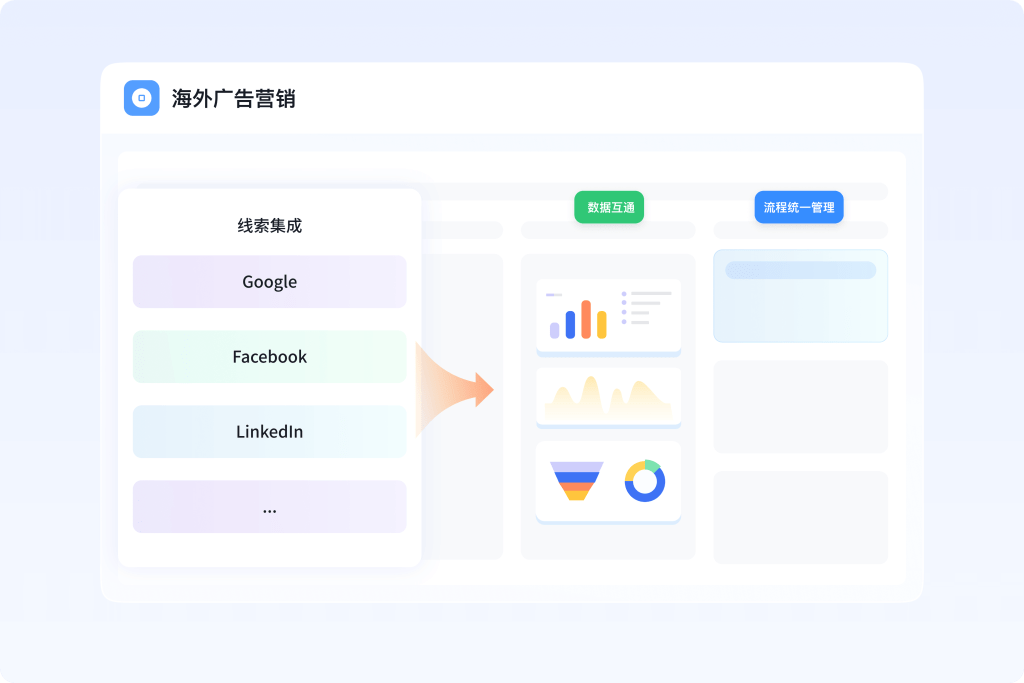 纷享销客营销云已全面对接Google Ads、Facebook Ads、LinkedIn Ads、TikTok Ads等海外主流广告平台,广告线索自动接入CRM。系统提供预设的广告数据大屏,支持从展现、点击、花费到线索、商机、订单的端到端ROI分析。