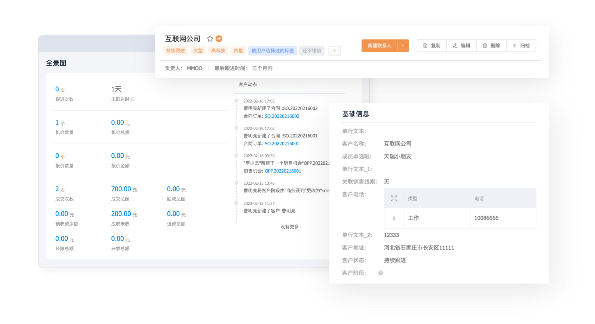CRM需要实现客户信息集中管理、沟通记录自动沉淀、归属权明确,支持客户智能标签与优先级划分,保障客户资源企业化、可追溯、可持续跟进。