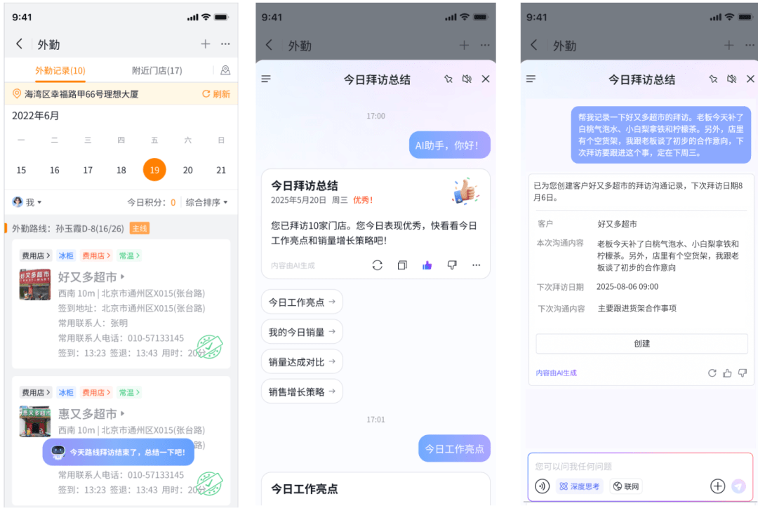 场景案例:小王今日门店拜访结束,他打开“AI访销大脑”,准备对今日的工作做个快速总结和记录。“帮我记录一下好又多超市的拜访情况。老板今天补了白桃气泡水、小白梨拿铁和柠檬茶。另外,店里有个空货架,我跟老板谈了初步的合作意向,下次拜访要跟进这个事,定在下周三。”