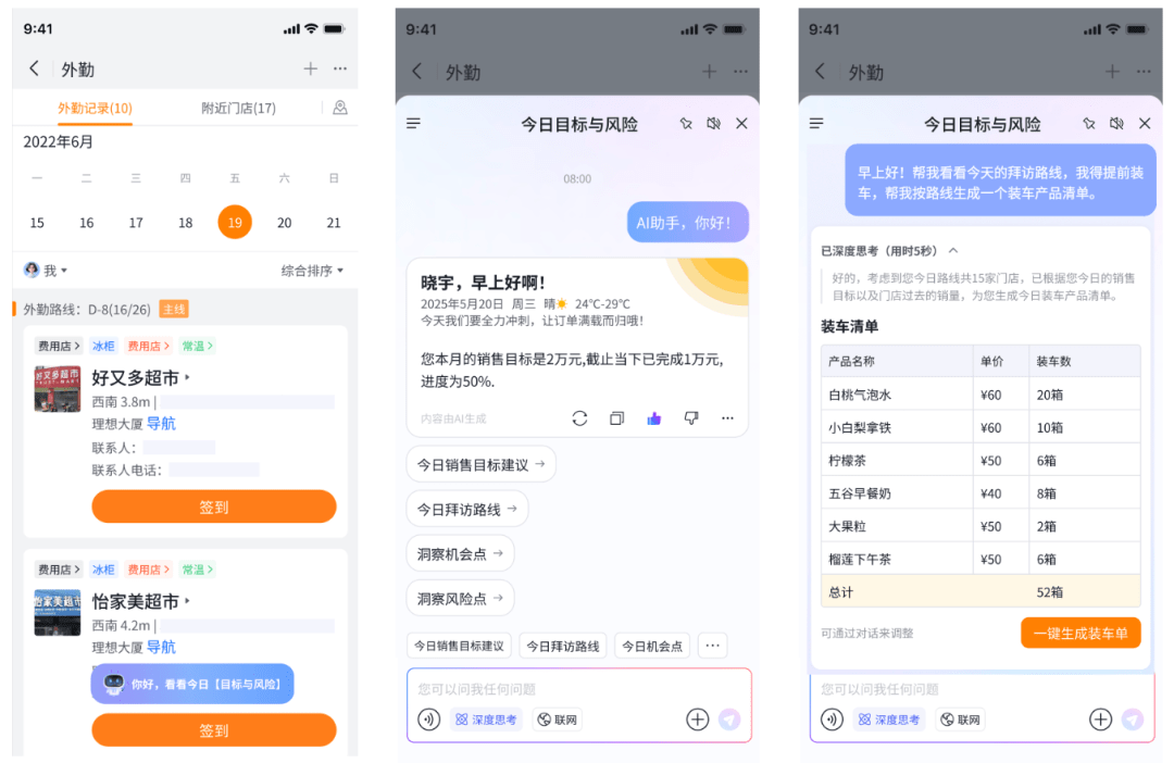 场景案例:清晨,晨会刚结束。业代小王熟练地打开了手机上的「AI访销大脑」,准备开始一天的拜访工作。“早上好!帮我看看今天的拜访路线,帮我按路线生成一个装车产品清单。”
