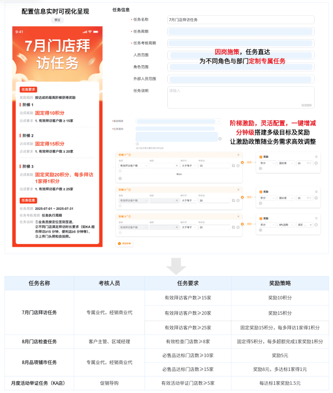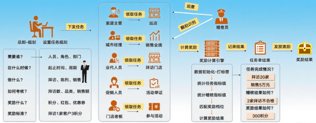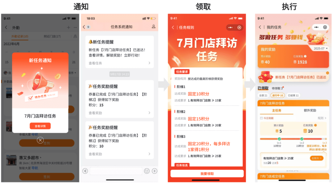 对一线人员:任务在线领取,执行即得反馈。每完成一家门店拜访,系统自动推送激励提醒,阶梯奖励实时累积,努力看得见、回报跟得上,如同游戏中的闯关晋级,充分激活员工自驱力。