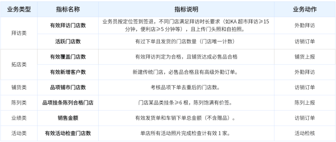面向一线业代,可设置“门店拜访量”“陈列达标率”“新品铺市”等动作类任务;