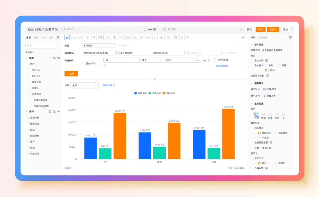 企业运营复盘、趋势研判、策略优化等工作,对数据的 “及时性” 与 “准确性” 有极高要求。纷享销客 CRM 的 BI 分析能力,通过数据实时同步与高效计算技术,大幅提升海量数据场景下的数据分析效能: