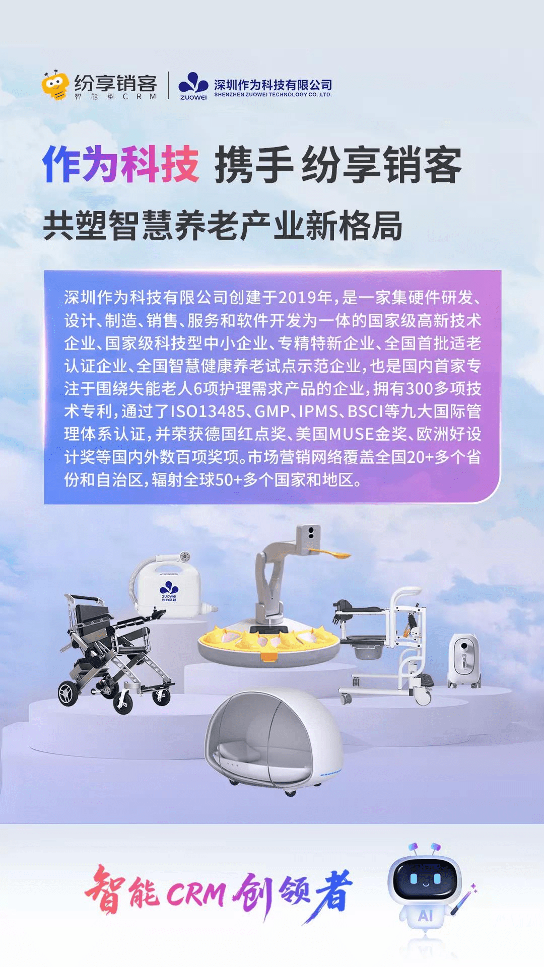 近日,深圳作为科技有限公司(以下简称“作为科技”)与纷享销客联合启动CRM项目。这家以“为天下失能家庭排忧解难”为使命的智慧养老科技企业,正通过与纷享销客的深度合作重构业务逻辑。此次合作既是作为科技深耕智能护理赛道、优化全链路业务协同的重要布局,更标志着双方将以智能型CRM为技术核心,在客户管理、跨部门协作等领域探索创新突破。