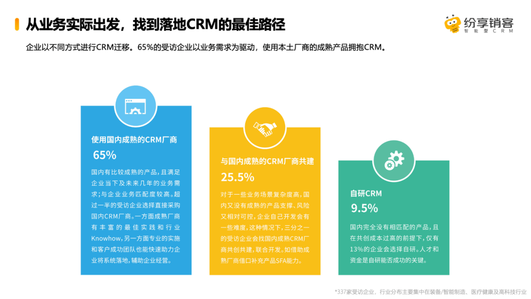 内外压力交织,迁移成为必然。调研显示,65%的企业优先选择“国内成熟 CRM 厂商”,因其本地化适配、服务响应更优,行业经验能助力企业用好新系统;25.5%的企业因业务复杂选择“与厂商共建”;仅9.5%的企业尝试自研,显示出企业对依托国产力量迁移的共识。