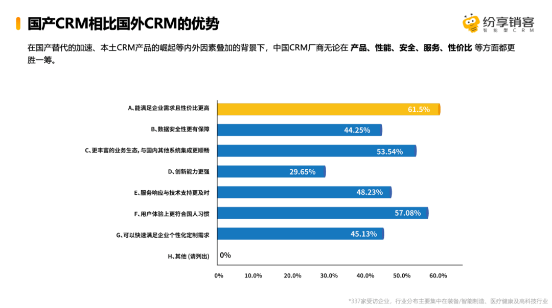 如今,国产 CRM 已实现“从替代到超越”。调研表明,61.5%的企业认为其“性价比更高”,44.25%的企业认可其“产品能力与服务体验超越海外厂商”。