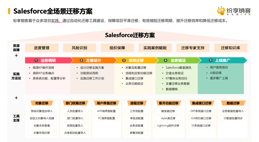 无论选择哪种路径,纷享销客都遵循“业务调研→方案设计→系统迁移→业务验证→上线推广”的五步方法论,且每一步都有专属工具支撑,大幅降低人工成本与风险。