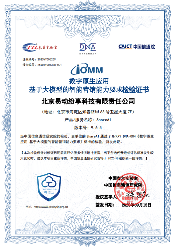 在这一过程中,纷享销客依托沉淀的大量客户流程数据与销售管理经验,不仅率先在行业内发布了企业级智能型CRM平台——ShareAI,完成了从连接型CRM到智能型CRM的华丽“转身”,也为通过《数字原生应用 基于大模型的智能营销能力要求》测评打下了坚实基础。